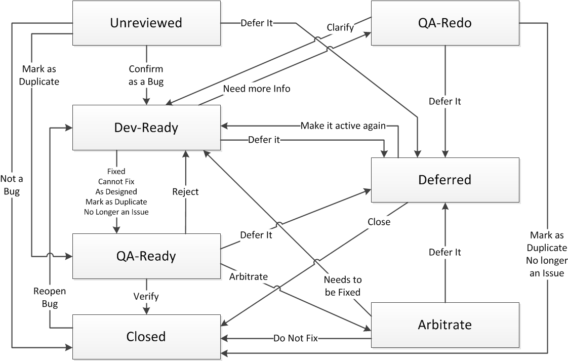 Consider a common path through the default bug workflow. A bug is reported, enters the Unreviewed state, and is sent to a QA engineer’s inbox. The bug is confirmed and sent to a developer’s inbox (Dev-Ready state). The developer claims to fix the bug and takes the Fixed action. The Fixed action sends the bug to QA-Ready with the reason code Fixed. The QA engineer who receives the issue verifies that the bug has been fixed. In other words, he takes the Verify action, which sends the bug to the Closed state, retaining the Fixed reason code.